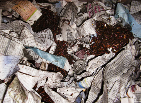 To set up your bin, you need to fill it about 3/4 to the top with shredded newspaper, which will act as the bedding, mimicking leaves in the worms’ natural habitat. The strips should be about one inch. Before putting them into the bin wet them in the sink and squeeze out the excess water until there are no drips. I found a weekend of the New York Times (which is also printed with soy inks) to be sufficient. When you have distributed and fluffed up the bedding it’s time to put the wigglers into their new home. Put them on top and cover with a layer on bedding, because worms are a bit sensitive to light. It may be a good idea to put some food for them to start, as well as a bit of soil in there so they can work up the grits they use to “chew” the food scraps. The food waste should always be placed on the bottom of the bin, underneath the newspaper.