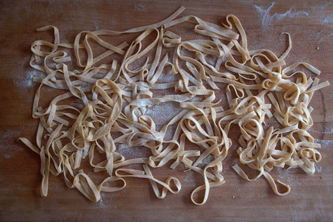 They became very good friends, and Hazan let Deschaine use her kitchen after hours to start the business, gave her the recipe, and showed her the technique. This was in 1981 and the company has not strayed one bit during the 27 years they have been in business. In the beginning, Deschaine was chief cook and bottle washer, accountant, and tireless promoter. Over the years, the company has grown, now employing about twenty people, but Monique and her husband Dennis are still developing new foods, and still go to trade shows to demonstrate the superiority of their products. That’s unflagging enthusiasm for you, but then there’s reason to be infatuated with this pasta. Knowing that she could never compete with the big pasta companies, Deschaine focused on making the best pasta out there, using the more time-consuming process of rolling out the dough and cutting it into shape. This achieves a superior texture for which Al Dente Pasta has become known.