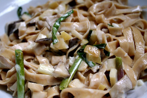 I’m partial to the Spinach Fettuccine, but if you’d like something a tad more exotic, why not try the Squid Ink or Wild Mushroom (both are fettuccine) or Spicy Sesame Linguine? If you’re counting carbs, you’ll find help here; there are several “Carba Nada” (get it?) Reduced Carb Pastas available. On the other hand, if you’re a whole grain fan, like I am, you’ll find three whole wheat blend choices, just the ticket for upping your intake of fiber and whole grains. The newest products on offer are Duets, all made with organic flour. These are clever blends of two different pastas in the same bag, so you have Farm and Field (egg and mushroom fettuccine); Land and Sea (egg and squid ink fettuccine); and Straw and Hay (egg and spinach fettuccine).