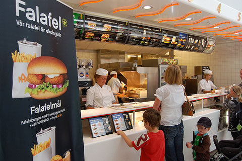 To minimize pollution from transportation, only Swedish beef and chicken is used in all restaurants (which in a country roughly the size of California could be considered somewhat locally sourced). Meals can be ordered with vegetable sides like salad, bean salad or carrots. During the growing season, a majority of vegetables are also sourced from within the country.