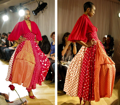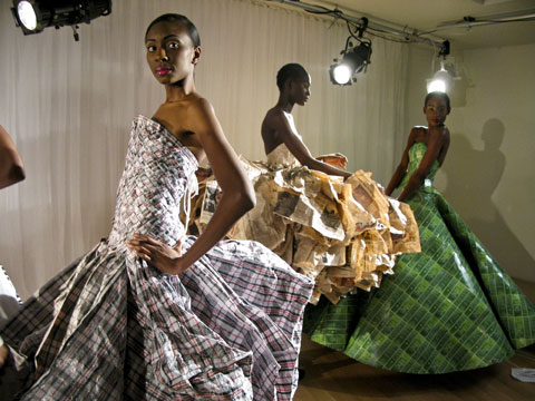 The billowing gowns were made from old jeans in different shades of denim (Levi 501’s of course), blouses, men’s shirts, military uniforms, logo T-shirts, laundry bags, baseball jackets, cardboard packaging, trench coats and scarves. The standout piece was a dress made out of 30 copies of the Financial Times; it served as a poignant reminder of how recycling will (must) serve an important part in our new financial climate. It is beautiful and disturbing at the same time, as is the quirky laundry bag dress. At least for New Yorkers, who have seen homeless people or scrappy street vendors carrying all their worldly possessions in these distinctly patterned red-white-and-blue checkered plastic vessels — icons of the streets. Now, Louis Vuitton’s leather version was far more sinister — but that was pre-recession-era irony.