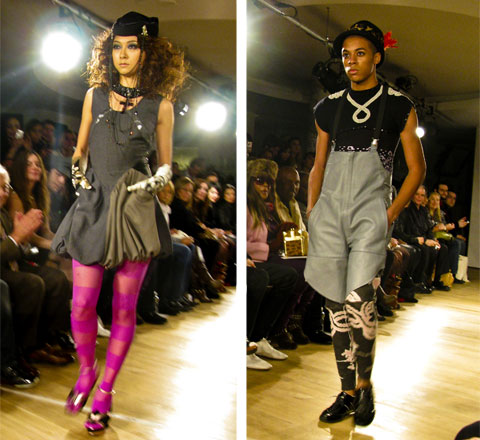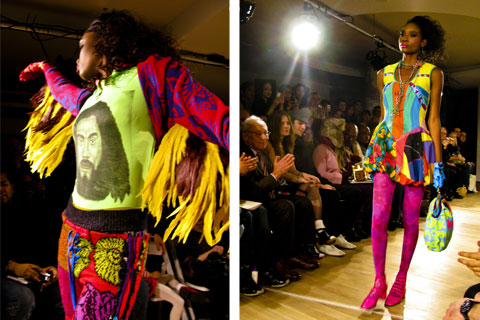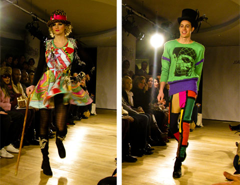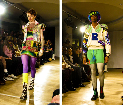Glorious turned into fierce and fabulous as Joann Berman‘s motley crew of models took to the runway. The feeling was very 80s NYC disco; this line from Berman’s bio offers some explanation: “She spent her nights at Club 57, danceteria and the MUDD club and played synthesizer in Patti Paladins band at CBGBs and Max’s Kansas City. In 1979, she ran away to London to become a punk rock star and sewed clothes for the Only Ones and Steve Strange and put herself through St. Martin by selling ice cream and bondage trousers.” There were no bondage trousers on this runway, but plenty of neon, feathers, shine and glitter, and a pair of gray lederhosen. These are clothes to have fun in, crazy lewd fun. It’s eco fashion as far away from hemp and muslin as can be.