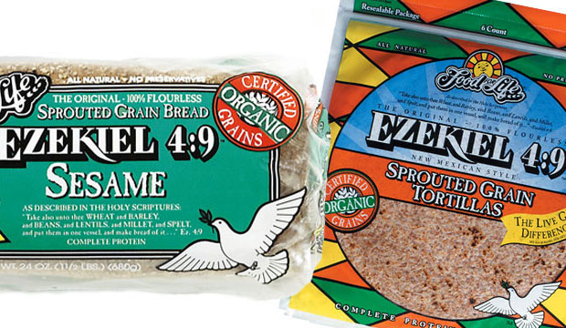 Top photo: Ezekiel 4:9 Organic Sprouted Whole Grain Sesame Bread & Whole Grain Flourless Tortillas.