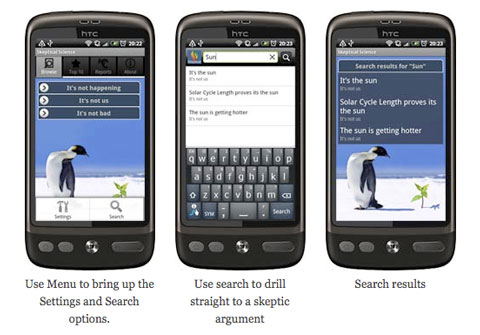 Says Cook, “The app looks at many arguments from climate skeptics and identifies a common pattern – that skeptics focus on small pieces of the puzzle while neglecting the full body of evidence…[it] aims to give you the full picture, with all the evidence, scientific context and links to peer-reviewed research. It has another useful function – users can send me reports on which skeptical arguments they encounter.”