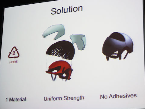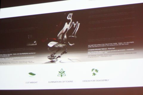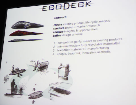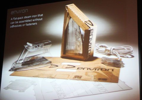 Speaking of teaching, the most popular panel (according to my very unscientific polling) was “Sustainability by Design” where five students from the Art Center College of Design showed incredibly innovative product design concepts they had developed at the school. Mark Huang showed a bike helmet — named the “Vespera” — designed to be made from one single material and without any adhesives. Most bike helmets are “monstrous hybrids,” meaning they cannot be recycled because they’re made from so many different materials (many of them toxic), so this would be a big step. The Eco Deck by John Phillips is a skim board designed with Life Cycle Analysis and recyclability in mind. Daniel Huang showed a concept for the “Environ,” a flat-pack steam iron that can be assembled without adhesives (there’s a theme here!) and fasteners. The design celebrates the materials and parts instead of hiding them, embodying transparency both visually and technically.