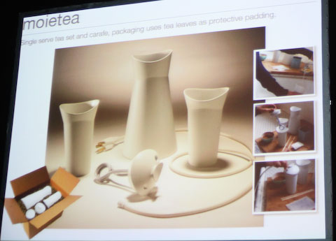 Magdalena Pauch’s “Spirit” car seat also employs LCA to make a lighter (requiring less gasoline), less toxic car seat that is designed for disassembly. Sharon Levy focused on a totally different issue, the amount of water and energy that is wasted when one overfills a tea kettle. This is apparently quite common, and not something we really think about. Her “Moietea” set includes single-serve cups and a carafe and is cleverly packaged with tea leaves used as protective padding.