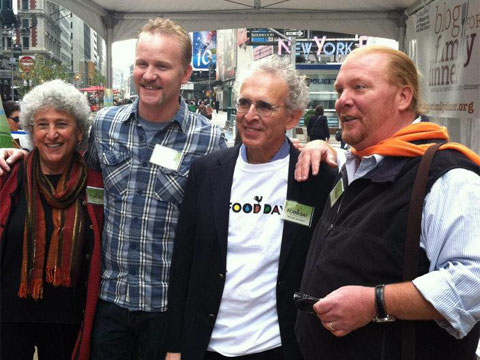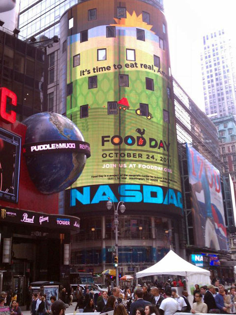 Instead, Food Day has partnered with some great organizations and is backed by an impressive advisory board that includes anti-hunger advocates, physicians, authors, politicians, and leaders of groups focused on everything from farmers markets to animal welfare to public health. But, the organizers say, “the most important ingredient in Food Day is you.” For a few months they have invite people, communities, restaurants, supermarkets and non-profits to organize an event and help make Food Day a success. There were events all over the country, most notable a sit-down dinner in the middle of Times Square in New York City. Food world notables like Marion Nestle, Mario Batali and Morgan Spurlock were in attendance, as well as Food Day founder Mike Jacobson. Above the dinner table, the message of the day loomed large on a billboard on the side of one of the buildings surrounding Times Square. Pretty cool if you ask me.