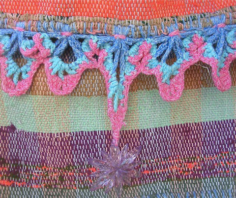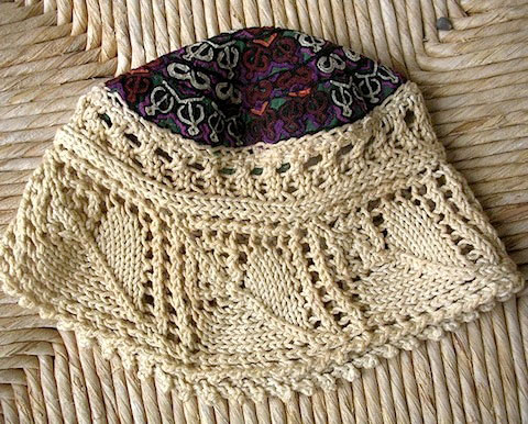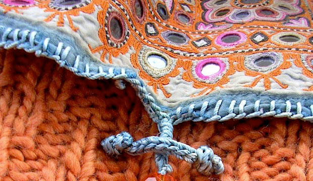 Featuring recycled textile from the intricately embroidered and multi-colored top of a Uzbek hat (hand-stitched a generation ago), this beautiful vintage bit found its way to Istanbul, where Bazaar Bayar resourcefully added a lace-like, knitted cotton tulip pattern to give it a genuinely Turkish twist.