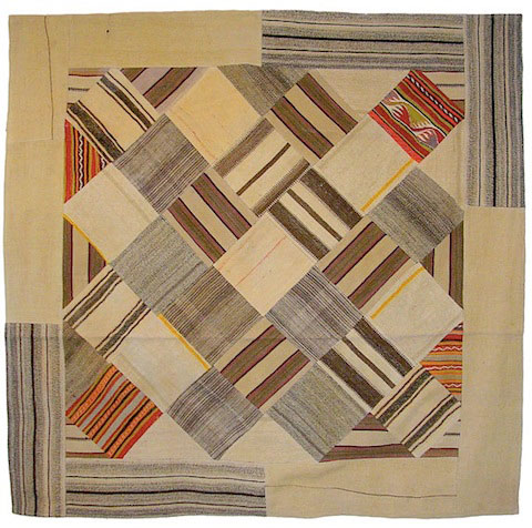 Bazaar Bayar’s vintage repurposed patchwork kilim in natural shades with shots of vibrant overdyed orange.