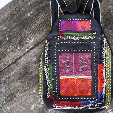 Remnants from vintage Uzbek and Turkmen handstitched embroideries, once adorning costumes and decorative home textiles, are made new, patched into a modern black cotton twill daypack trimmed with glass beads. Artful and practical, this cool pack is a distinct statement of style, pattern, and collaborative chic.
